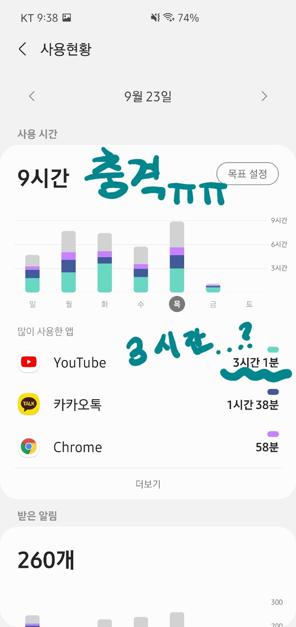 저의 어제 사용시간입니다. 9시간이라니... 유튜브를 3시간 넘게 보다니...