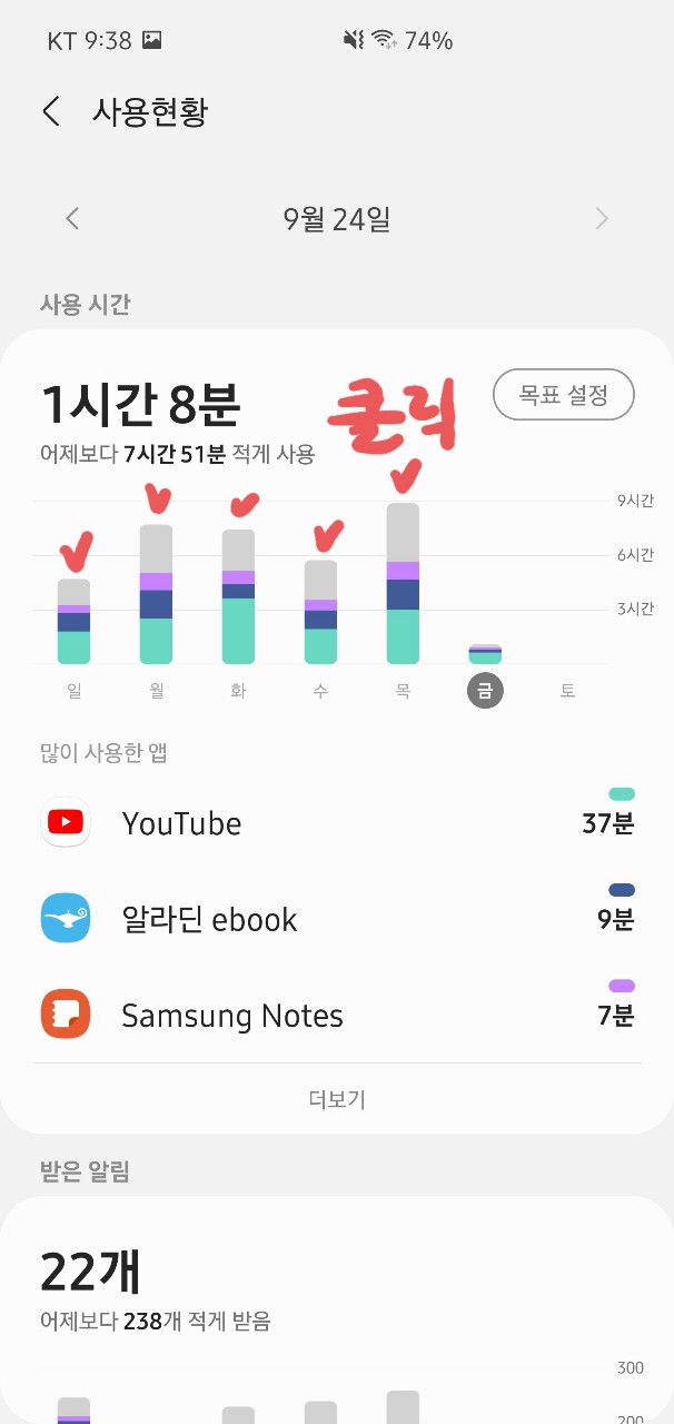 5. 마무리! 이제 아래 사진처럼 각각을 클릭해서 지난 날의 사용 시간을 보시면 됩니다!